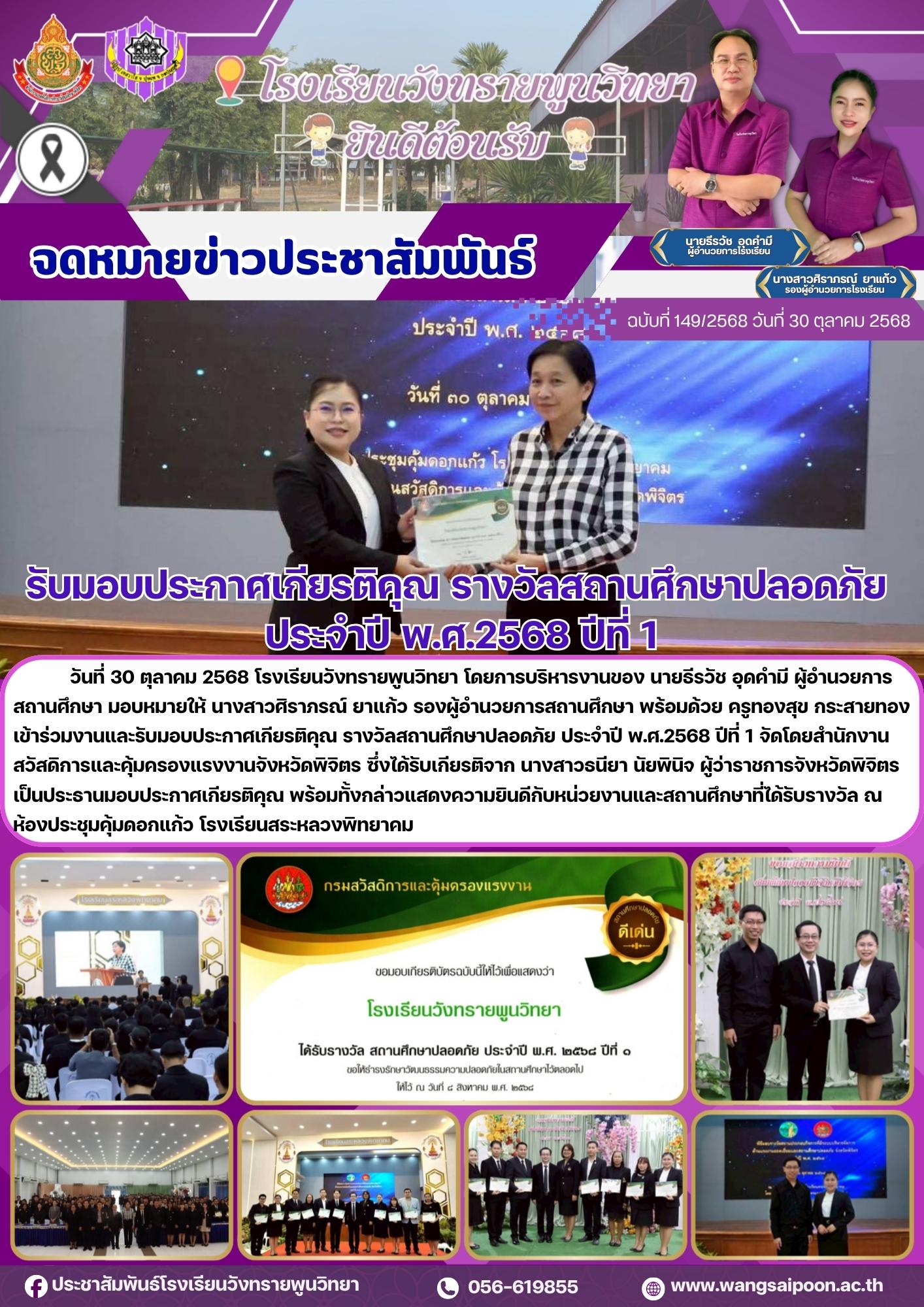 รับมอบประกาศเกียรติคุณ รางวัลสถานศึกษาปลอดภัย ประจำปี พ.ศ.2568 ปีที่ 1